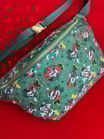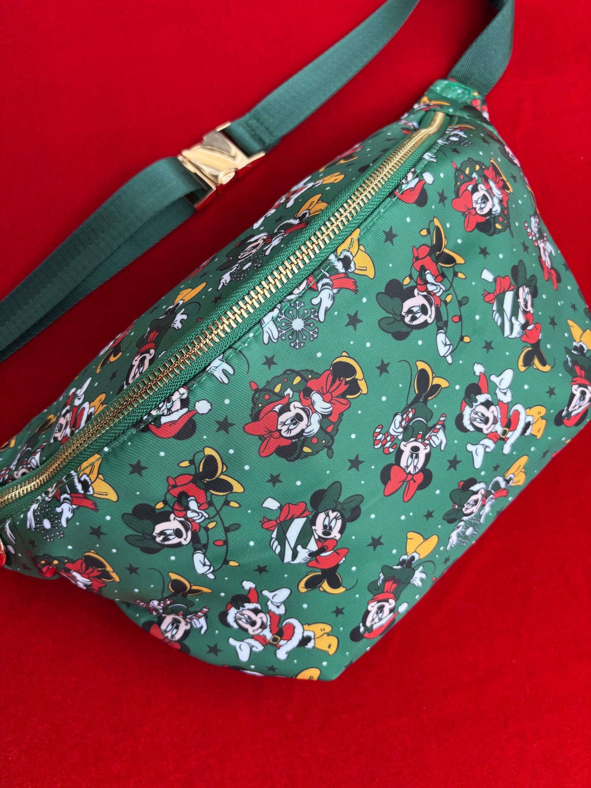 This high-quality, waterproof, scratch-resistant belt bag is perfect for theme parks. It features a cream exterior with a matching zipper and belt. The interior is lined in cream and includes a zippered pocket. The bag is finished with gold hardware accents.