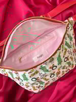 This high-quality, waterproof, scratch-resistant belt bag is perfect for theme parks. It features a light pink exterior with a red zipper and belt. The interior is lined in pink and includes a zippered pocket. The bag is finished with gold hardware accents.