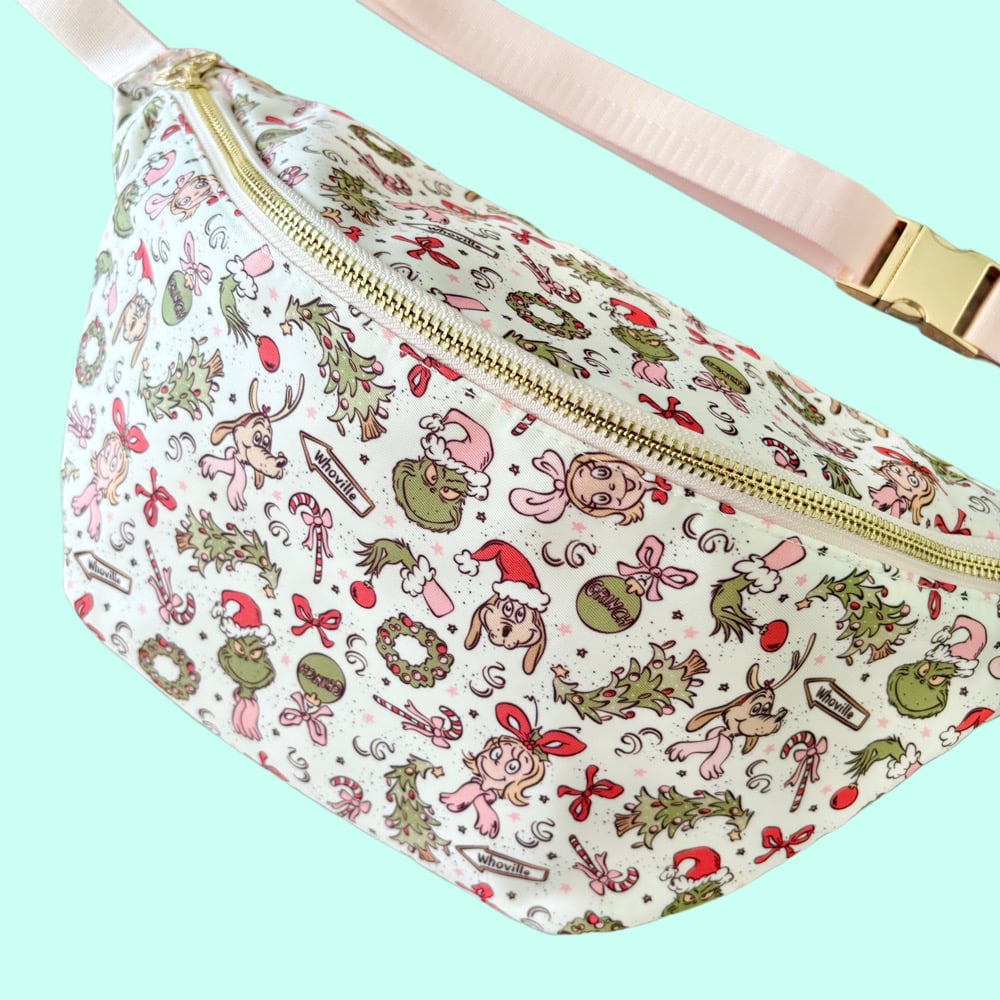 This high-quality, waterproof, scratch-resistant belt bag is perfect for theme parks. It features a white exterior with a light pink matching zipper and belt. The interior is lined in pale pink and includes a zippered pocket. The bag is finished with gold hardware accents.
