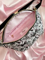 This high-quality, waterproof, scratch-resistant belt bag is perfect for theme parks. It features a pink exterior with a matching zipper and belt. The interior is lined in white and includes a zippered pocket. The bag is finished with gold hardware accents.